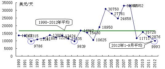 經(jīng)濟(jì)復(fù)蘇乏力或內(nèi)生動(dòng)力不足直接對(duì)全球政治、軍事、民生、金融等產(chǎn)生極其不利影響,使從來(lái)沒(méi)清澈過(guò)的地球村變得更為渾濁,發(fā)展前景變得更為不確定性,對(duì)本已十分低迷的航運(yùn)市場(chǎng)形成新的壓力與沖擊,直接把今年國(guó)際航運(yùn)業(yè)拖入了歷史罕見(jiàn)的冰點(diǎn)。2012 年1-9月克拉克松航運(yùn)綜合費(fèi)率平均水平跌破1萬(wàn)美元/天關(guān)口,與1992年和1999年水平相當(dāng);BDI平均點(diǎn)數(shù)下跌至907點(diǎn),創(chuàng)出1999年以來(lái)的新低。