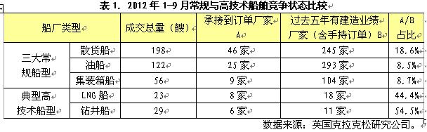 第三,與油氣勘探、開(kāi)采、生產(chǎn)、運(yùn)輸環(huán)節(jié)相關(guān)船型與海工裝備市場(chǎng)表現(xiàn)相對(duì)活躍。不完全統(tǒng)計(jì),2012年1-9月全球累計(jì)成交各類船舶(含海工裝備)金額約590億美元,其中,與油氣勘探、開(kāi)采、生產(chǎn)、運(yùn)輸相關(guān)船舶與海工裝備等產(chǎn)品(油船、LNG船、LPG船、鉆井船、各類平臺(tái)、海工輔助船等)合計(jì)成交金額達(dá)456億美元,占總量78%,僅海工裝備成交總金額就高達(dá)355億美元,占總量比重高達(dá)60%。海工裝備市場(chǎng)的活躍對(duì)有效阻止船舶市場(chǎng)整體行情進(jìn)一步下滑起到重要的支撐作用。