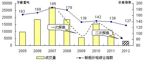 當(dāng)人們欣喜看到2010年船舶市場(chǎng)“強(qiáng)勁復(fù)蘇”,寄希望2011年仍能保持這種態(tài)勢(shì)的時(shí)候,2011年世界經(jīng)濟(jì)、貿(mào)易、航運(yùn)市場(chǎng)風(fēng)云突變,船舶市場(chǎng)外部環(huán)境再度發(fā)生惡化,加上隱藏于船舶市場(chǎng)船舶產(chǎn)業(yè)深層次矛盾與問(wèn)題的不斷暴露,船舶市場(chǎng)重返下行通道,2012年這種情況變得更為糟糕。按克拉克松公司統(tǒng)計(jì),2012年1-9月全球累計(jì)成交新船訂單781艘、3230萬(wàn)載重噸,月均360萬(wàn)載重噸,較上一年月均成交量下滑46%,甚至比2009年月均水平(上次谷底)還低25%,呈典型“二次探底”之勢(shì)。隨著成交量的持續(xù)萎縮,新船價(jià)格進(jìn)一步下滑,2012年9月底克拉克松新船價(jià)格指數(shù)報(bào)收于127點(diǎn),較上年底下跌12點(diǎn),并創(chuàng)下2008年價(jià)格下行以來(lái)的新低。