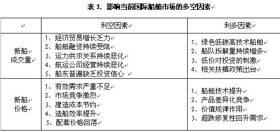在外圍經(jīng)濟(jì)和航運(yùn)市場(chǎng)環(huán)境再度惡化的情況下,年初以來(lái)國(guó)際船舶市場(chǎng)新船成交量和價(jià)格仍舊延續(xù)上年下跌態(tài)勢(shì),但需求結(jié)構(gòu)變化仍為行情發(fā)展提供了新的機(jī)遇與氣象。從發(fā)展態(tài)勢(shì)來(lái)看,影響市場(chǎng)的消極因素仍然占據(jù)主導(dǎo)地位,短期內(nèi)蕭條的行情狀態(tài)不會(huì)發(fā)生根本變化,如果航運(yùn)與造船市場(chǎng)能在今年完成充分觸底的話,來(lái)年行情定會(huì)出現(xiàn)修復(fù)性反彈(談不上“復(fù)蘇”),但不管市場(chǎng)好轉(zhuǎn)與否,滯后性決定船舶行業(yè)經(jīng)濟(jì)運(yùn)行情況可能更為糟糕。