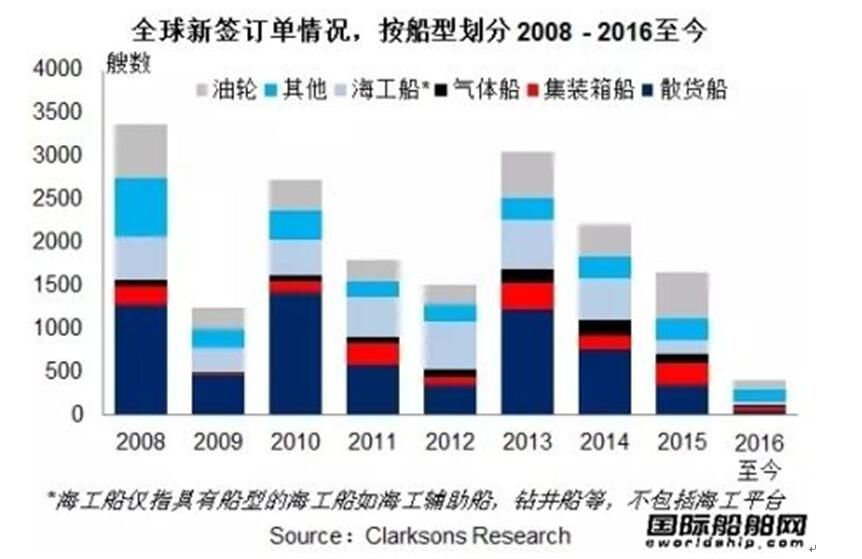 支撐散貨船訂單量的基本只有在中國船廠訂造的30艘Valemax型礦砂船。油輪新簽訂單僅成交117艘,同比下降76%,尤其是大型原油油輪訂單明顯減少。盡管有一些特殊油輪訂單如小型化學品船及瀝青船等,但其體量對總訂單量的貢獻仍然有限。集裝箱船訂單的情況與油輪類似,從數(shù)量來看同比下滑72%,市場對大型集裝箱船的興趣明顯減弱,3,300TEU以上的訂單僅成交5艘。與此同時,巴拿馬運河的拓寬、韓進海運的破產(chǎn)、集運聯(lián)盟的整合、兼并等,更是增加了集裝箱船市場的不確定性。今年的新簽訂單主要集中在一些特殊船型領(lǐng)域,如受船隊更新需求影響,歐洲船東訂立的一批客滾船訂單等。豪華郵輪訂單尤為顯眼,共計有32艘簽訂,已超過2014及2015年的總量,其訂單總價值占全球新簽訂單總額的約一半。