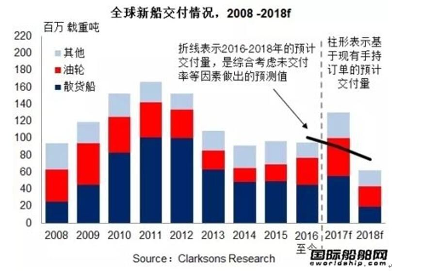 在新簽訂單量大幅減少和交付量穩(wěn)定的共同作用下,全球手持訂單量加速縮水:2016年12月初手持訂單量為3,713艘,2.3億載重噸,較年初相比縮減27%。按數(shù)量統(tǒng)計,散貨船仍占手持訂單的27%,油輪和集裝箱船則分別為23%和11%。如果以2015年的產(chǎn)能為基準粗略估計,當前的手持訂單量僅能平均維持船廠未來2.4年的生產(chǎn)。(來源:克拉克森研究)