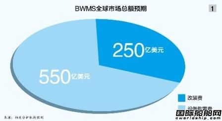 相關(guān)分析機(jī)構(gòu)做出預(yù)測稱,《壓載水公約》生效后將給BWMS制造商帶來近800億美元的市場總量,對于BWMS這種船配市場的輕量級產(chǎn)品來說,這個數(shù)字是驚人的。另據(jù)某投行交通事業(yè)部的進(jìn)一步分析,這塊800億美元的“大蛋糕”由占總比68.75%、總額達(dá)550億美元的設(shè)備購置市場和占總比31.25%、總額達(dá)250億美元的改裝市場構(gòu)成(見圖1)。